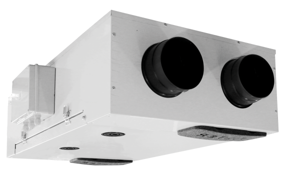 Unidad VMC a doble flujo canalizado con recuperación de calor, adecuada para instalación en techo o falso techo, en posición horizontal.